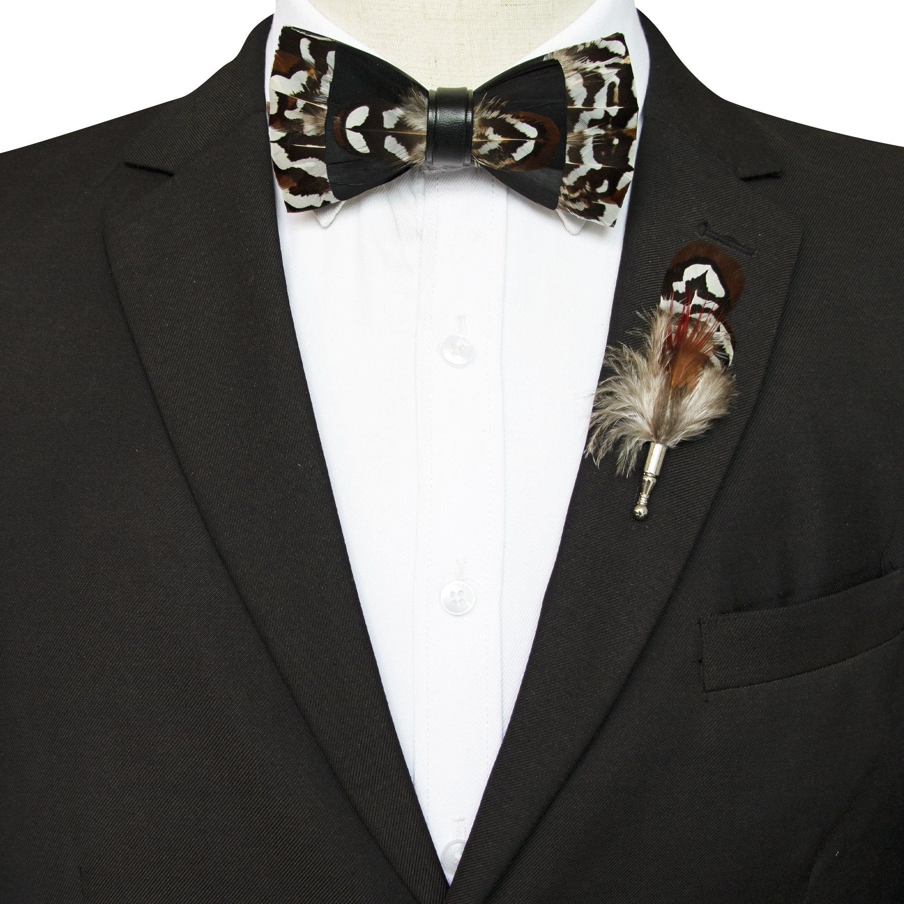 Black & Brown Gentle Feather Bow Tie with Lapel Pin